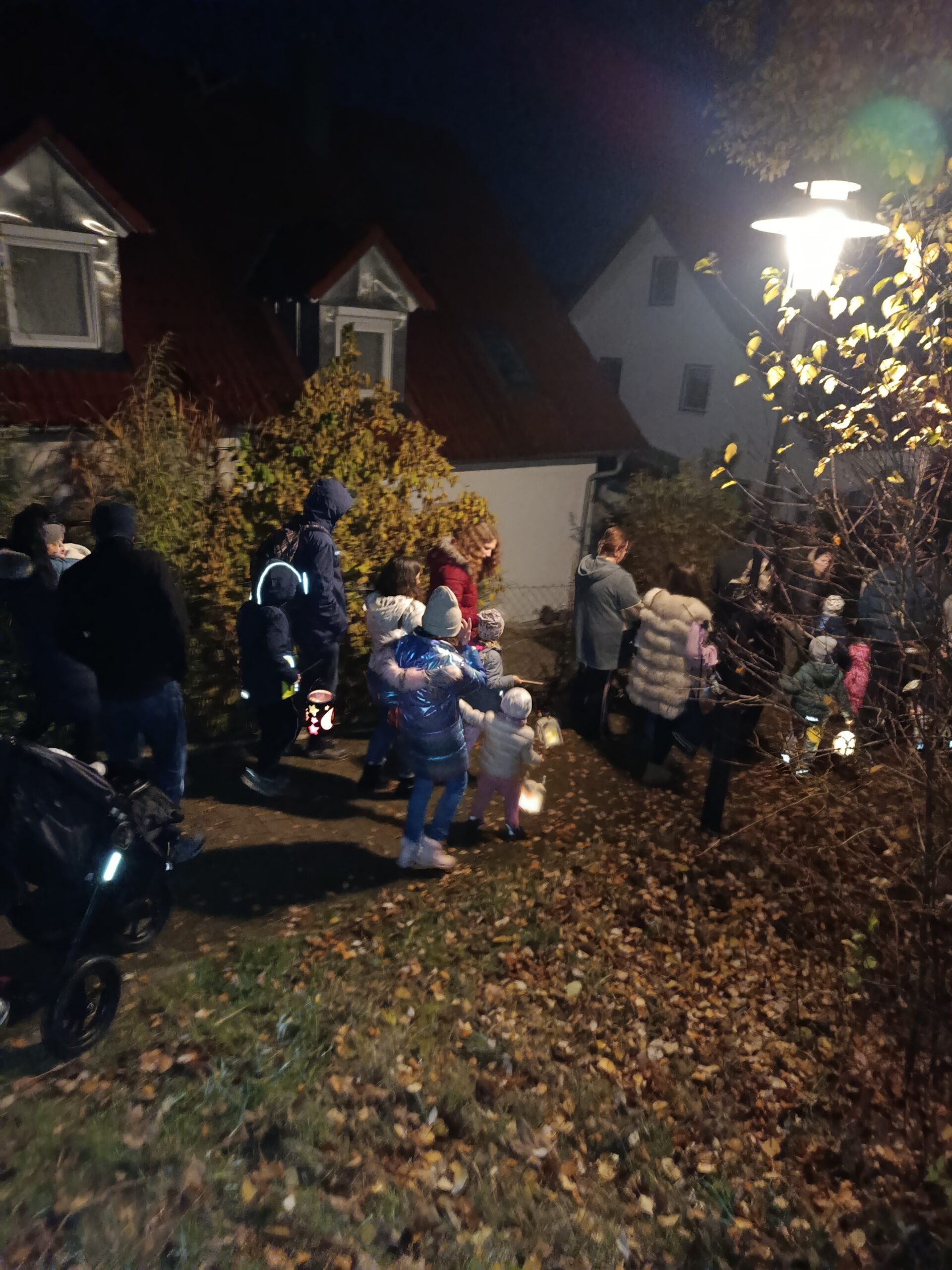Im direkten Anschluss begeisterten die Kindergartenkinder mit einer liebevoll vorbereiteten und einstudierten Aufführung des Liedes „Lichterkinder“, in die sie viel Mühe und Freude gesteckt hatten. Danach startete unser Laternenumzug durch einen kleinen Teil Nandlstadts. Ein herzliches Dankeschön gilt der Freiwilligen Feuerwehr, die uns begleitete, die Straßen absicherte und so für die Sicherheit aller Teilnehmenden sorgte.